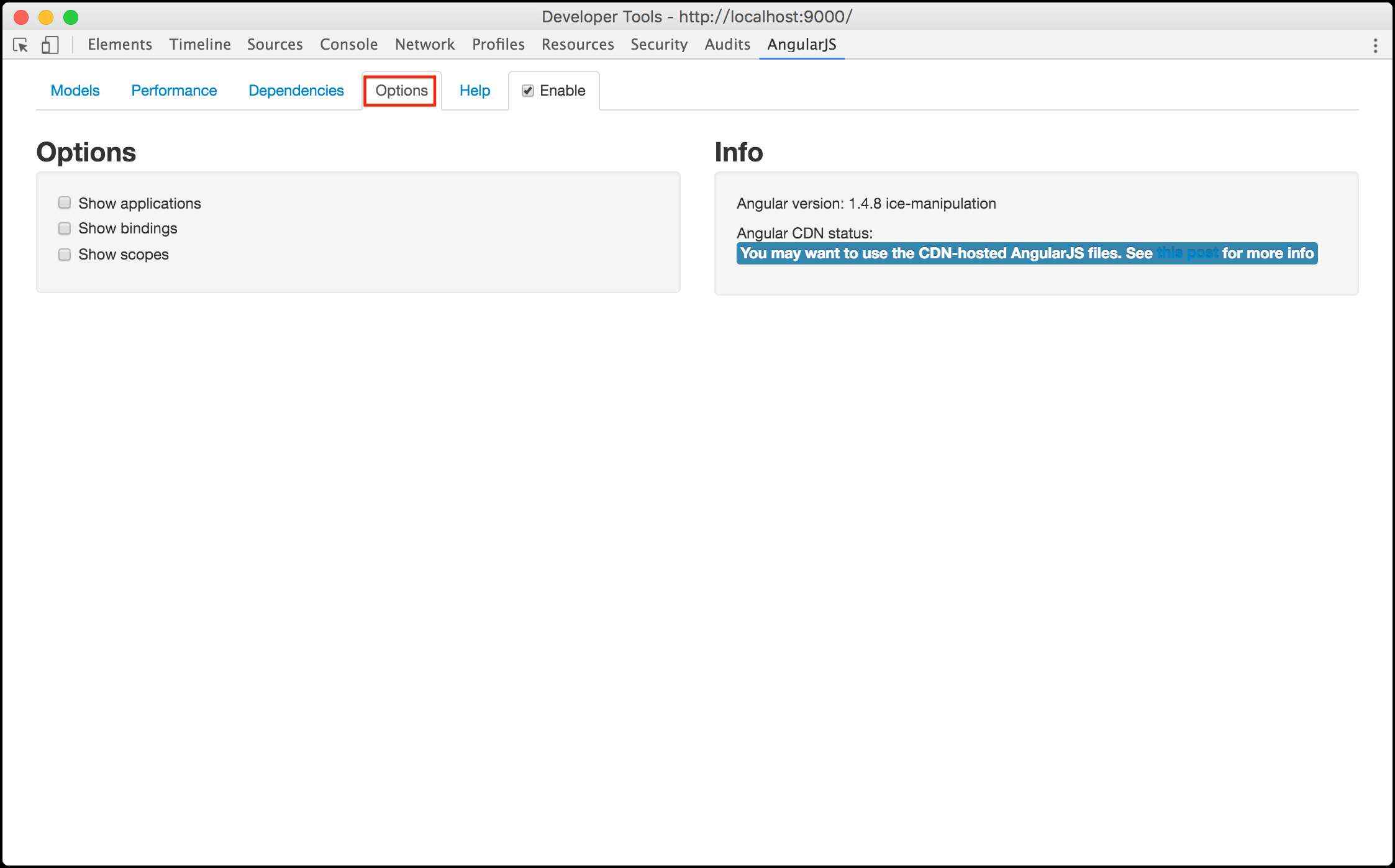 最后是options页面。有三个选项:”show applications,” “show scopes,” 和 “show bindings.”。每个选项勾选时,在debugger时,相应的内容会在页面高亮。