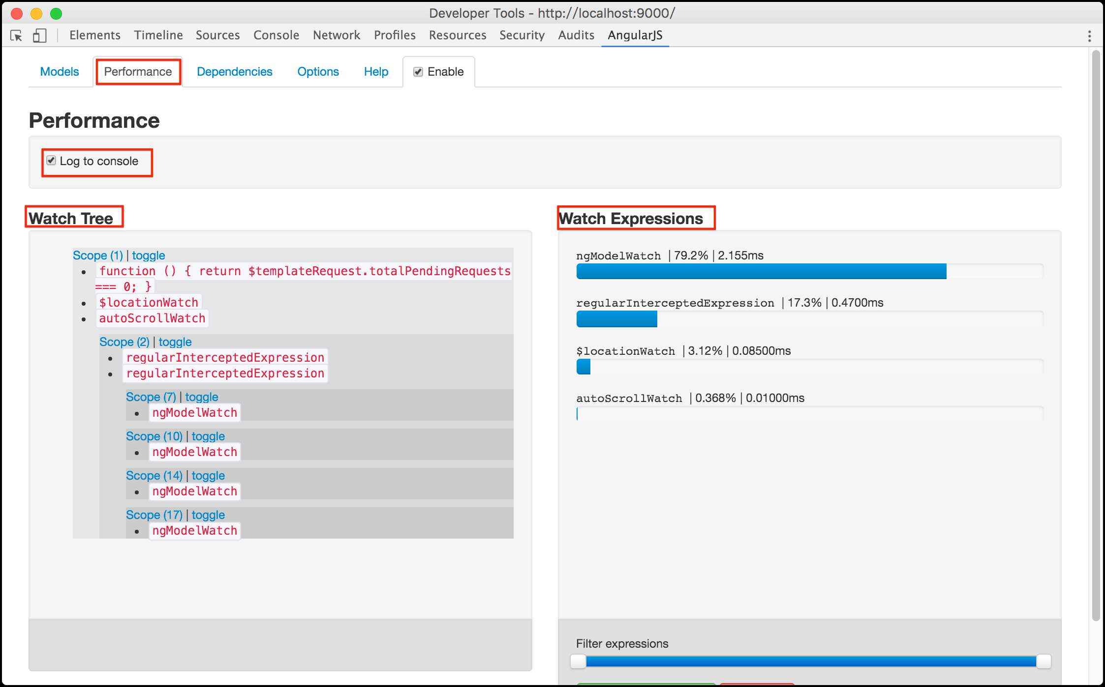 Performace展示的是该应用的性能,左侧显示的是监控树,右侧显示的是监控表达式的性能,这个页面能帮助我们进行性能优化。