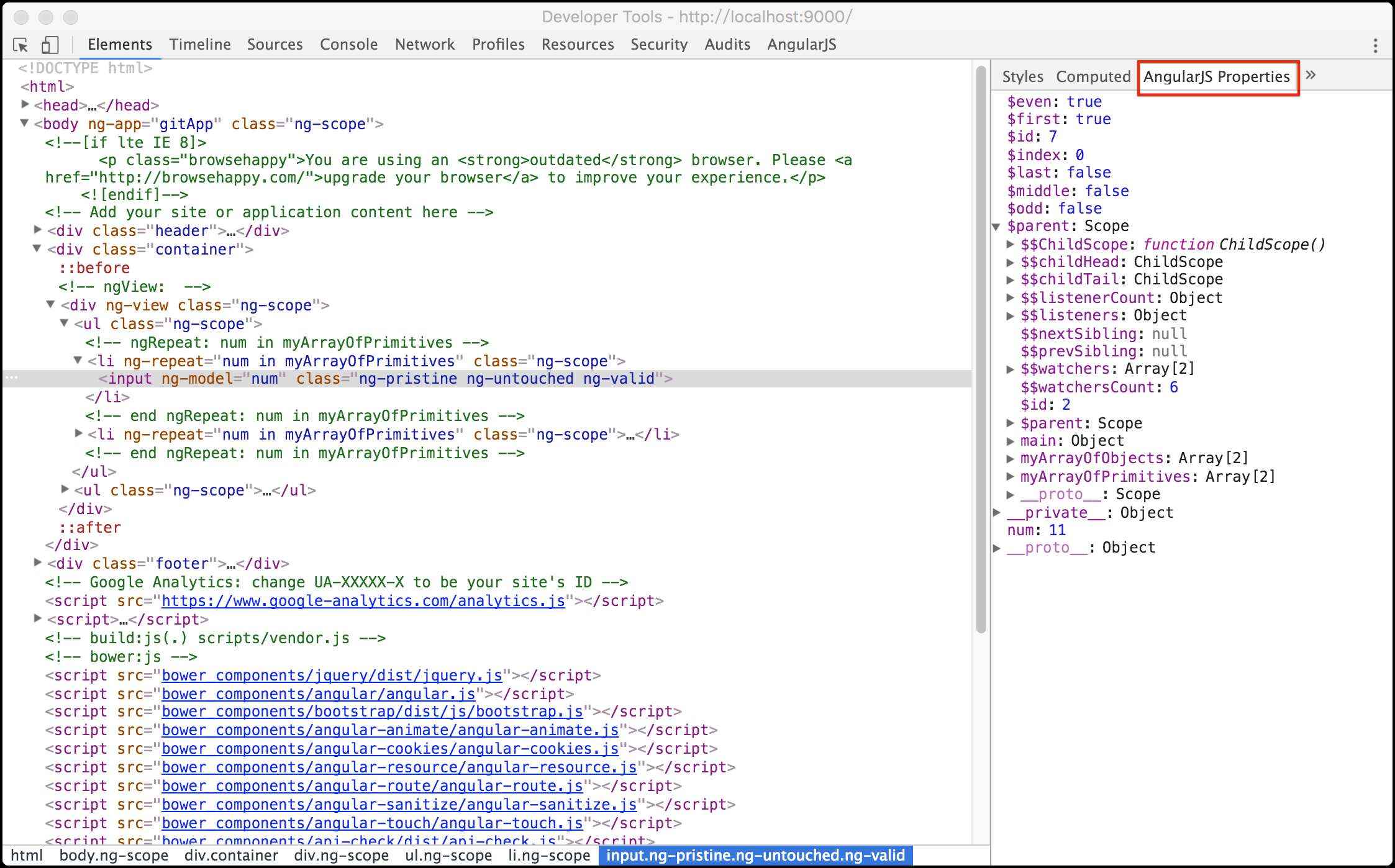 其实我最常用的应该是Element右侧的AngularJS Properties标签。在Element标签中选定某个标签时,Element页面的右侧的内容,会多一个AngularJS Properties页面,该页面显示的是选定的html内容的作用域的属性,该功能对于对Angular Scope的理解非常有用。如果不是很理解Angular Scope,可以多用一个这个功能。