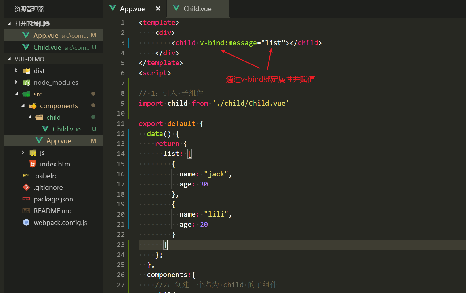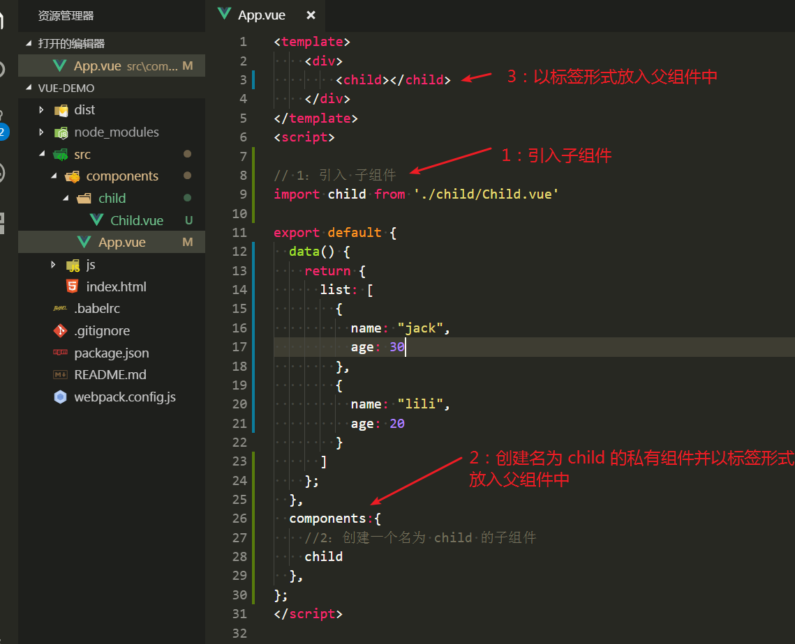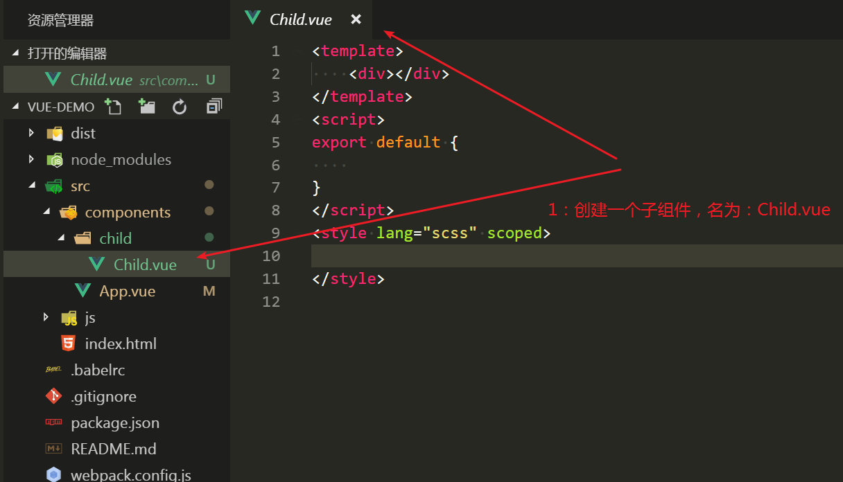 1:在src/components/child/文件夹下,创建一个名为:child.vue的子组件