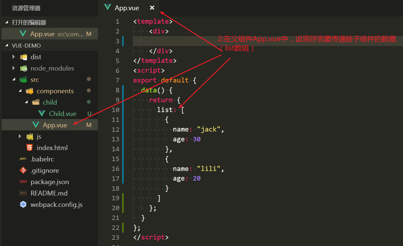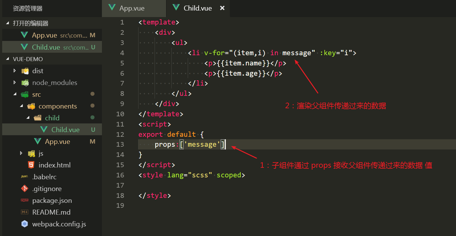 子组件在props中创建一个属性,用以接收父组件传过来的值父组件中注册子组件在子组件标签中添加子组件props中创建的属性把需要传给子组件的值赋给该属性