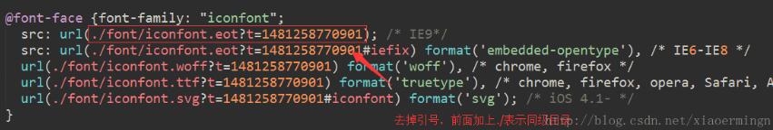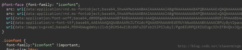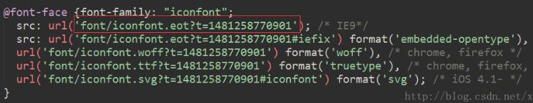 打开iconfont.css文件,原本的字体文件引用路径是用的css的方式,即下面图片中所示的