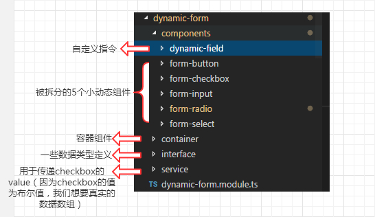 实际上我们把动态表单拆分成了一个个小的动态组件(不预先加载),由外层的一个组件充当一个容器,所有的动态组件都会在里面进行生成和销毁,他们共同组成了一个动态表单。调用ComponentFactoryResolver和ViewContainerRef生成组件的的这部分逻辑没有集成在外层容器中,而是交给了一个自定义的指令和ng-container。因为指令没有视图,他通过注入ViewContainerRef获取到的是宿主的视图容器。由于ng-container不会被渲染,所以获取到的视图容器就是外层组件容器的视图容器。