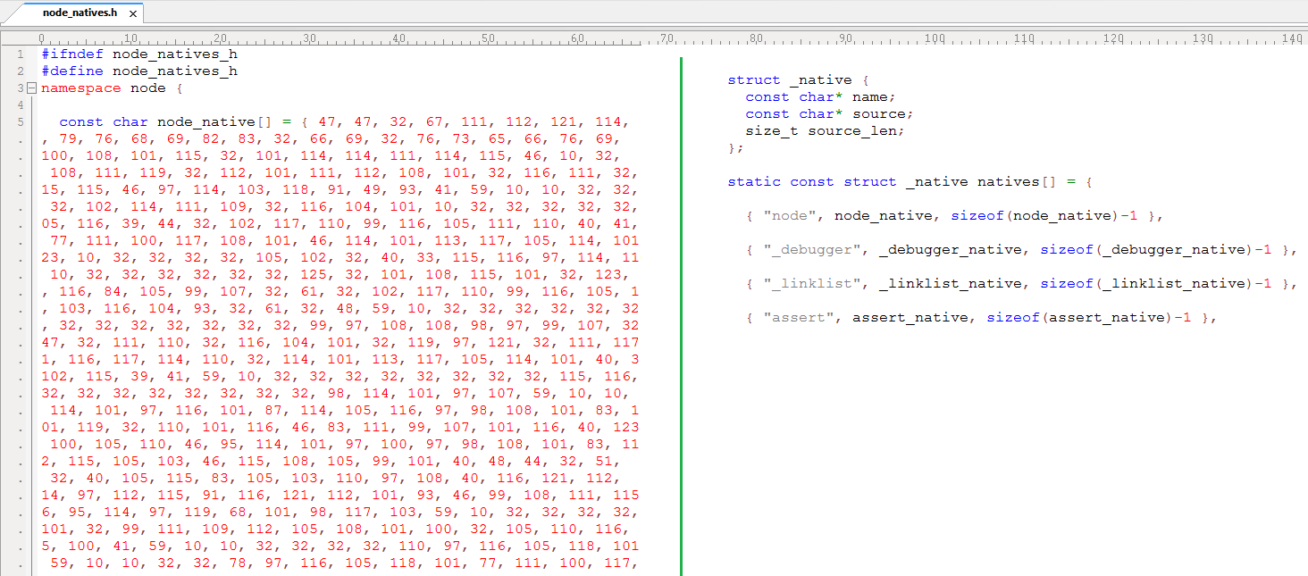 该文件是由js2c.py生成,它会把Nodejs源码中的lib目录下,所有js文件转成ASCII码,并存放在相应的数组里。