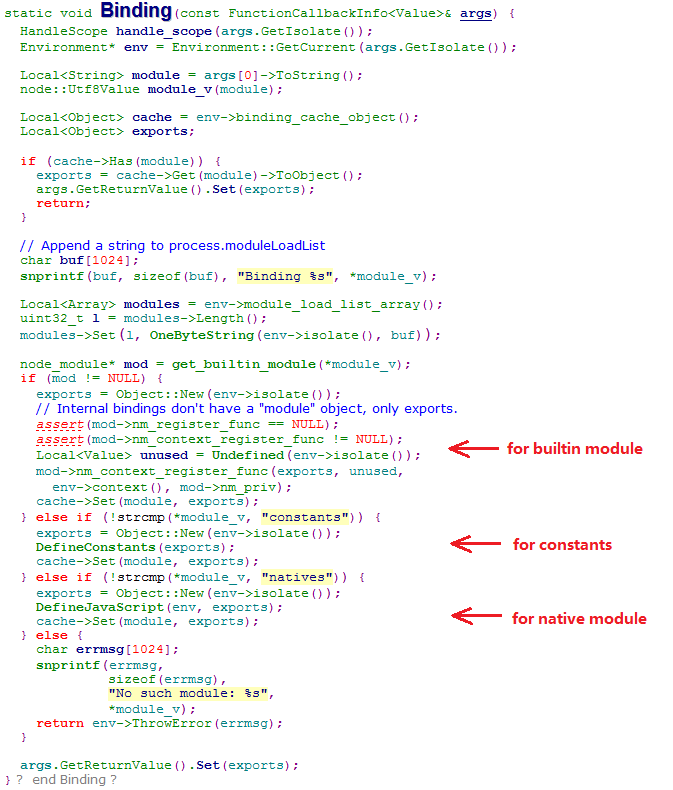 在node.cc里面提供了一个binding()函数,当我们应用require()来引用另外一个模块时,binding()函数便会被引入。下面我们分析一下这个函数: