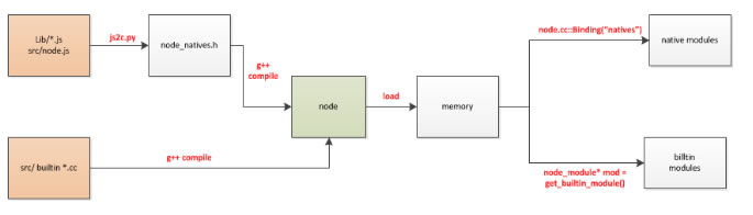 其实无论是naive JS module 还是 builtin C++ module,最终都是要被编译成可执行文件。对于两者的提取方式,却大不相同,js module 使用process.binding('natives'),而C++ module 则直接使用get_builtin_module()。