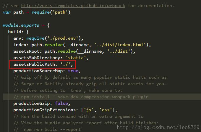 assetsPublicPath: ‘./'(编译出来可以本地查看,‘/'没有点的就直接发布到线上)