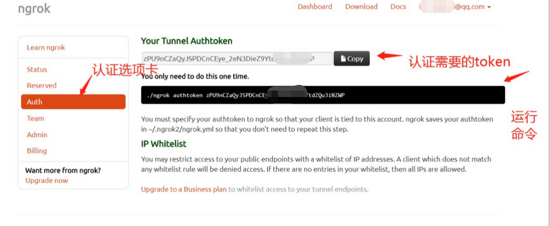 一:首先介绍一下ngrok,ngrok主要的功能就是将本地的ip映射到外网 ,并且分配给你一个可用的域名,通过这个域名可以让外网用户打开你的本地的web服务,使用起来也很简单,官网也有文档也有详细介绍 。这里简单的介绍一下使用方法,首先去ngrok 的官网下载ngrok的对应的客户端 ,并且注册用户 ,可以通过你的github账号或者google账号注册 ,注册完成后再个人中心打开auth选项,复制这里的authtoken,如下图: