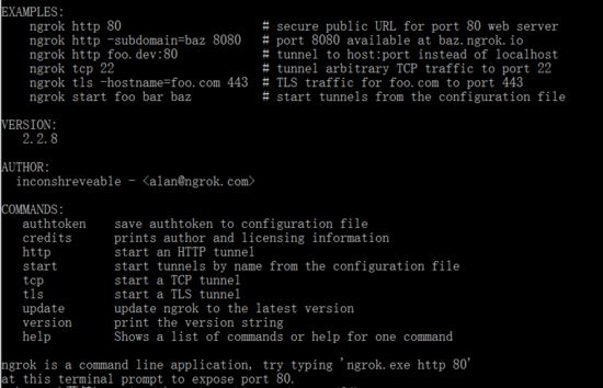 认证完成后,就可以操作了,上图中的examples就是一些常用的示例命令,我们用到的就是ngrok http,后面接的参数就是你本地web服务的端口号,运行后会分配一个外网域名,通过这个域名就可以访问到你的本地web服务,