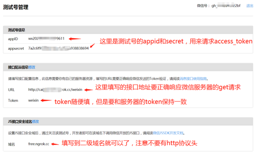 二:得到域名后,接下来我们要做的就是使用该域名完成微信安全域名绑定啦,我们可以去微信公众平台申请一个测试号,不过这时候填写时无法通过的,因为微信认证需要拥有一个自己的服务器正确响应配置请求