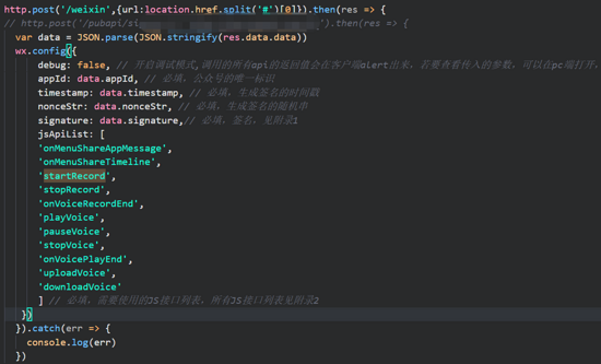 当然到这还没有结束,因为前端想要调用jssdk的接口还需要通过接口请求完成权限配置,这里大家可以看一下微信jssdk的说明文档,具体引用步骤这里就不赘述了,接口请求大概如下: