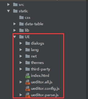 下载之后,把资源放到 /static/ue/ 静态目录下。文档结构如下: