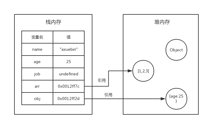 此时name,age,job三种基本数据类型是直接存在栈内存中的,而arr,obj在栈内存中只是存了一个地址来表示对堆内存中的引用。