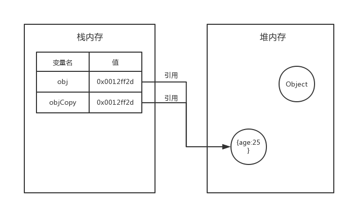 如果所示,执行了var objCopy=obj之后,obj和objCopy具有相同的地址值,执行堆内存中的同一个实际对象。