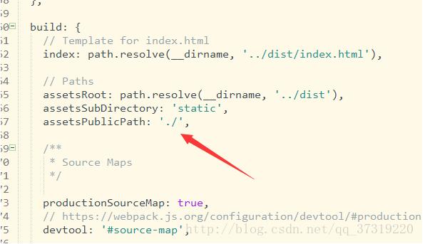 看清楚是 build(上边还有个dev 是开发环境下的配置,不需要改动)下的 assetsPublicPath :将‘/'改为‘./'