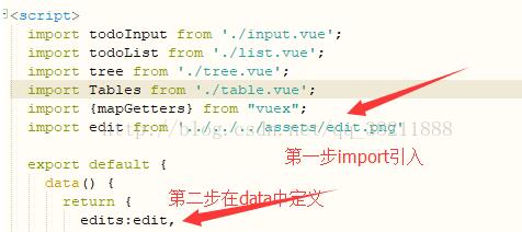 第一步:在.vue文件中import edit from 'path'(path是图片与.vue的相对路径)