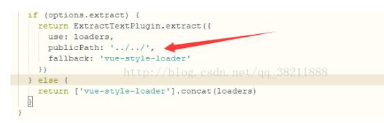 前提是你用了vue-cil,那么在build目录下找到utils.js中的ExtractTextPlugin.extract({}),里面添加下面这个属性就完美解决了publicPath: '../../'