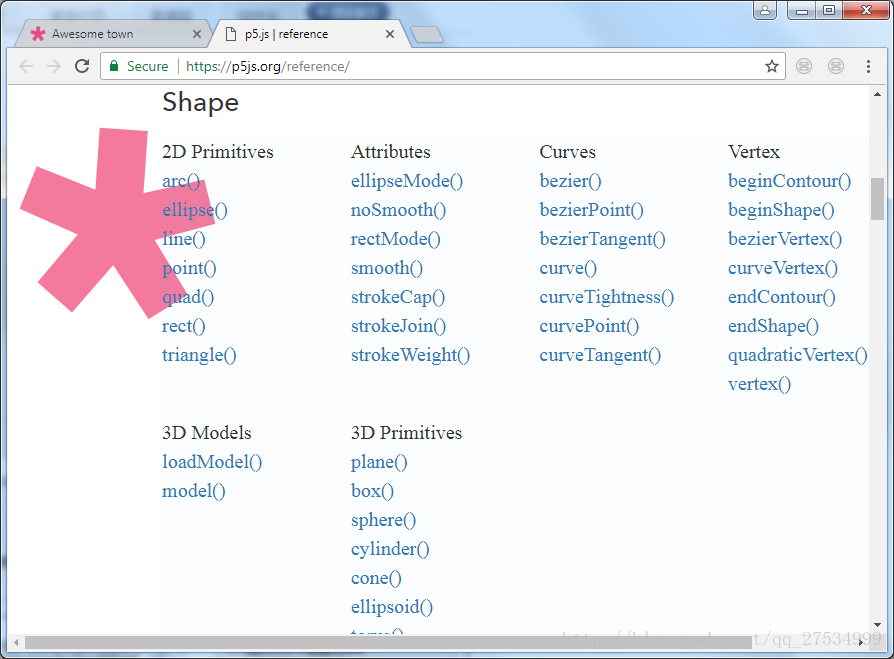 p5.js官网提供了Reference,对每一种函数都进行了详细的解释,可以通过查阅这些函数的用法来进一步学习p5.js,网址如下: