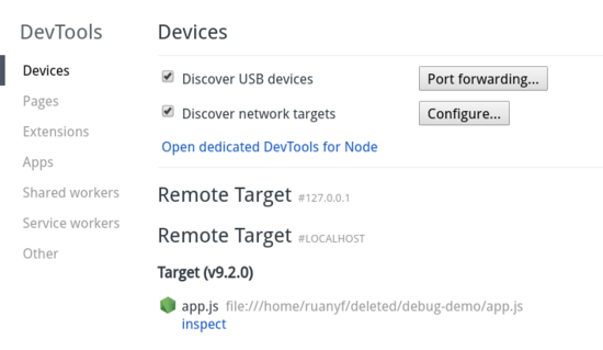 访问 chrome://inspect ,就可以进入调试工具,调试这段代码了。