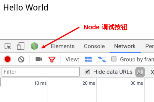 上面代码中, --inspect 参数是启动调试模式必需的。这时,打开浏览器访问 http://127.0.0.1//3000,就可以看到 Hello World 了。