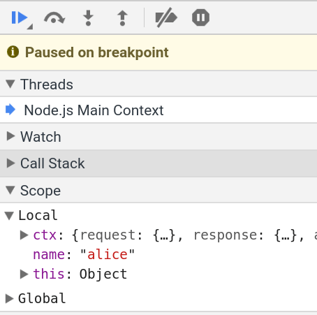 这时,浏览器访问 http://127.0.0.1:3000/alice ,页面会显示正在等待服务器返回。切换到调试工具,可以看到 Node 主线程处于暂停(paused)阶段。