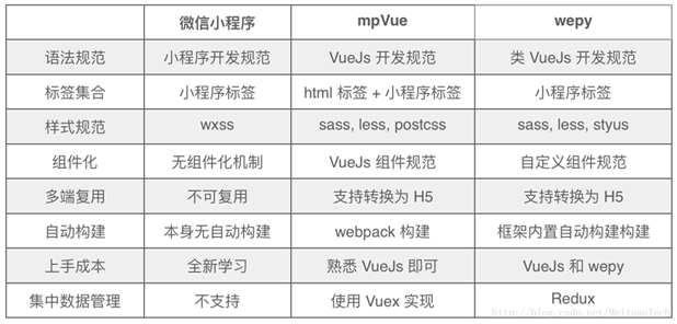 在表2中,我们对微信小程序、mpvue、WePY 这三个开发框架的主要能力和特点做了横向对比,帮助大家了解不同框架的侧重点,结合业务场景和开发习惯,确定技术方案。对于如何更好地使用 mpvue 进行小程序开发,我们总结了一些最佳实践。