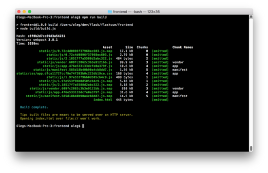 所以/dist文件夹的HTML、CSS、JS会在同一级目录/frontend 。现在你可以运行 $ npm run build 创建一个包。