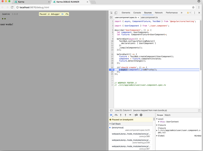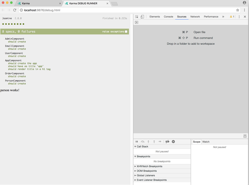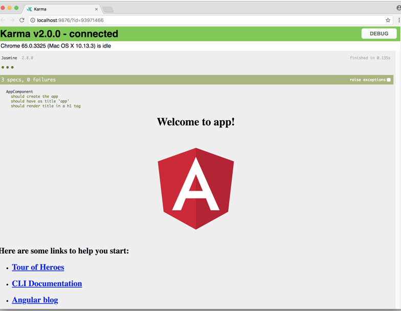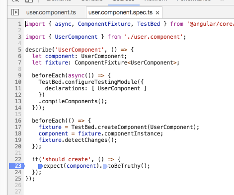 执行测试的话就执行ng test即可, 它会执行项目里所有的.spec.ts文件.