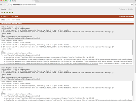 这时因为运行测试的时候, admin模块是独立运行的, 所以该模块并没有引用Router模块, 所以无法识别router-outlet.