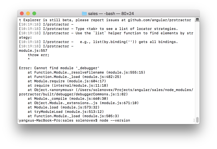 如果可以正常运行这个命令的话, 终端窗口会出现“Debugger listening on xxx: ”字样, 然后就可以在下面输入变量或者表达式来查看它们的值从而进行调试了.