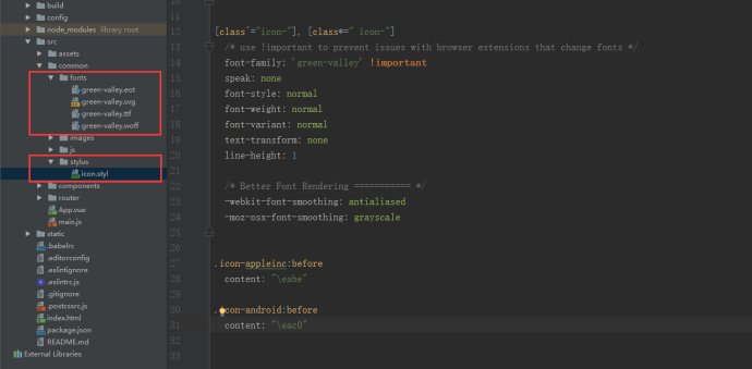 3.在vue项目里src文件夹中新建common文件夹,将这里的fonts复制到common中,再在common文件夹中新建一个stylus文件夹,将这里的style.css复制到stylus中,这个css文件放的是图标的相关样式代码,我放进去后改成icon.styl便于识别(PS:我是用stylus预处理器,所以新建stylus,并且后缀名为styl,不同预处理器可以不同,这个见仁见智,只是尽量遵循代码规范而已),放入后的文件夹结构如下: