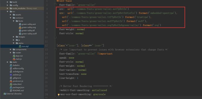 4.那么现在就是重点了,刚解压的文件中style.css中@font-face的url路径是需要修改成项目中的路径的,修改如下: