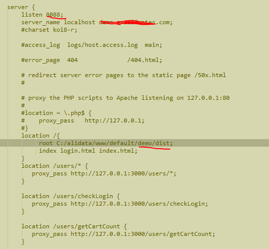 3、配置部署,编辑nginx/conf 下的nginx.conf,修改如下