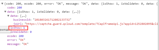 然后当你频繁多次调用发送短信的接口,直到触发了需要调用腾讯验证码时( 这个判断是后台告诉你的 ,比如我们项目中接口传参的JSON中有个isShow的变量,如果等于1则要触发腾讯云验证了,默认状态下是0,就是不需要腾讯验证。具体情况问你们的后台去,手动滑稽)