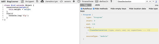 如图,我们写了一个es6的类,然后网页的右边帮我们生成了一个AST,其实就是把每一行代码变成了一个对象,这样我们就实现了一个映射。