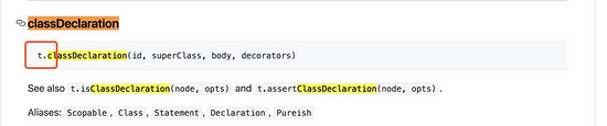 比如,我们想创建一个类,先到astexplorer.net中转换,发现类对应的AST类型是 ClassDeclaration 。好,我们去文档中搜索,发现调用下面的api就可以了: