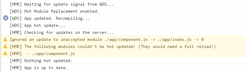 通过webpackHotUpdate对相应模块进行更新。0表示模块的id,"./app/component.js"表示模块对应的name。结构是webpack(id,{key:function(){}})。function外带了一个括号,不知道有什么作用。webpackHotUpdate的定义是这样的: