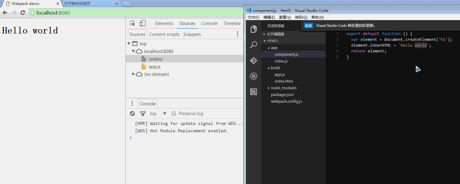 这个时候页面更新了。每次改动页面上都会增加一个带有hot-update.js ,类似于下面这样: