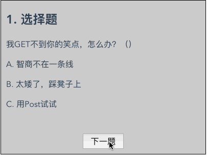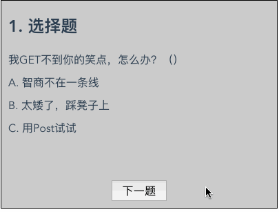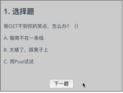 不管怎么样,上面的轮播模式都不太适用于我们的场景,其中一个是这种答题的场景不需要切回上一题,每道题做完就不能回去了,更重要的一个是我们 不希望一次性把所有的slide都渲染出来 ,这样会导致每张幻灯片里的资源都触发加载,就比如img标签虽然你把它display: none了,但是只要它的src是一个正常的url,它就会请求加载。 由于slide往往会比较多,就不使用这种轮播插件了。