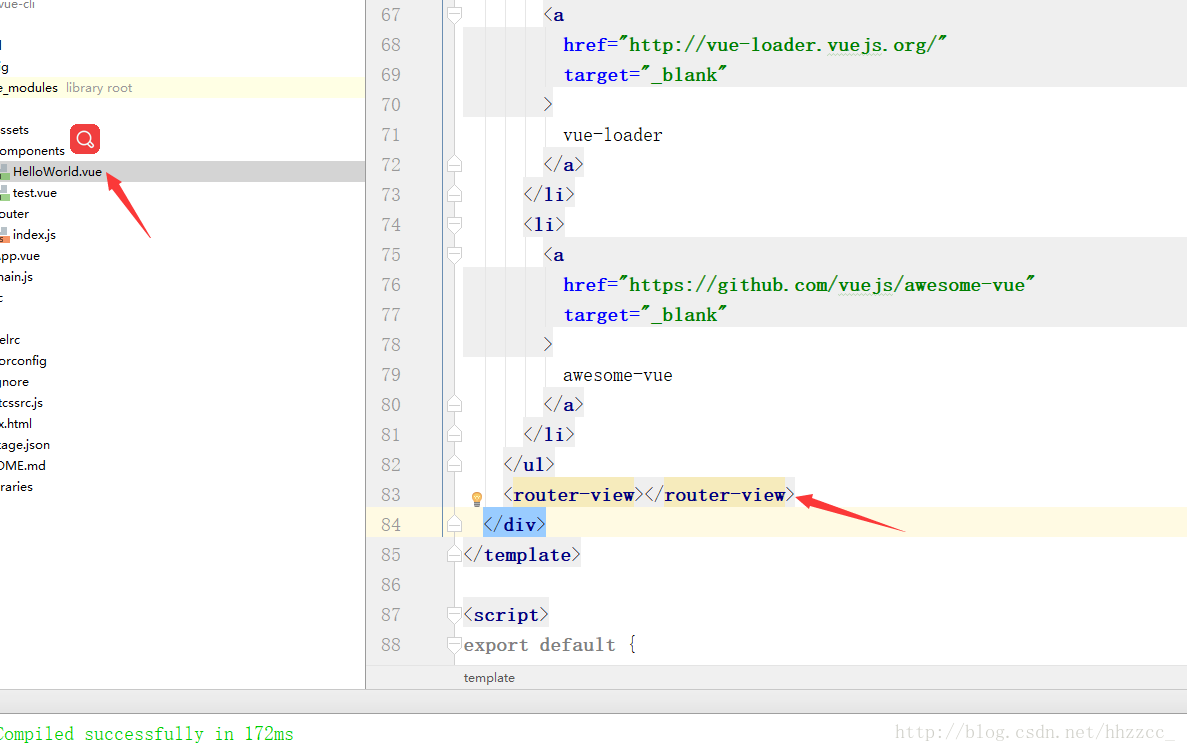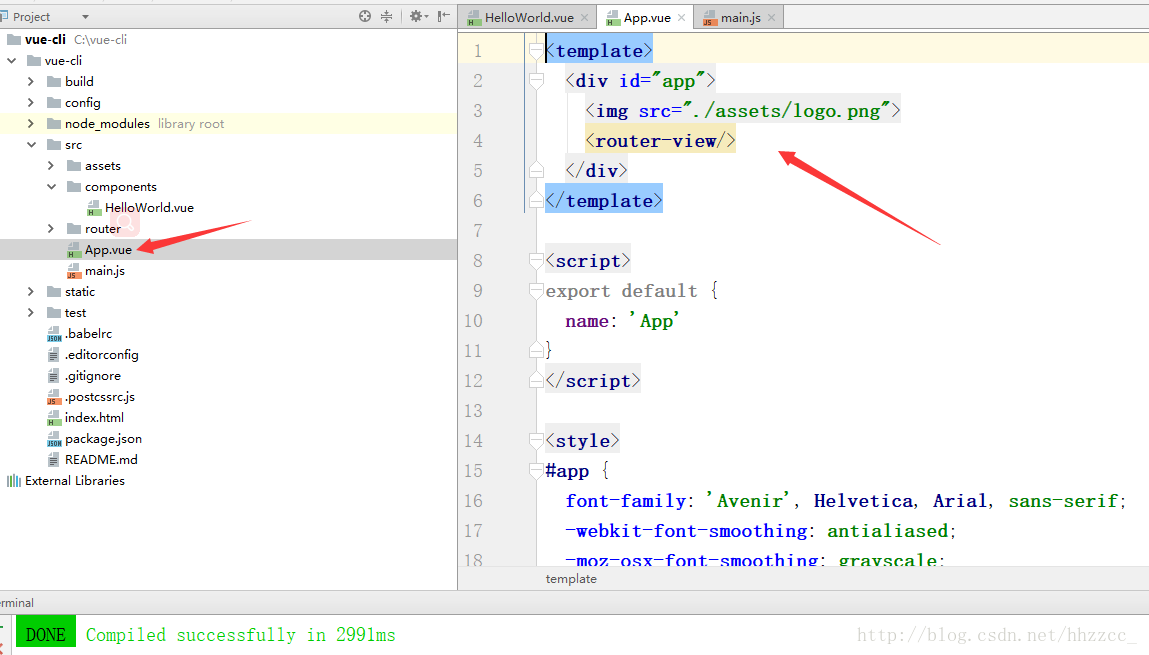 先从这个App.vue开始,这个文件仅此于外部的index意思就是index包含所有页面,而App.vue包含除了index的页面,也就是路由嵌套,后面会说到,在这里所创建的文件都是文件名.vue,页面的html格式就是一个template标签中包含一个div,相当于组件化的形式,而组件的内容写在这个div中(一个页面必须只有一个template包一个div,内容写在这个div中,不然会报错),而这个router-view标签就是当前页面下的子页面,可以理解成这个router-view是另一个页面,被当前页面所包含着,有点类似ifame标签的功能。