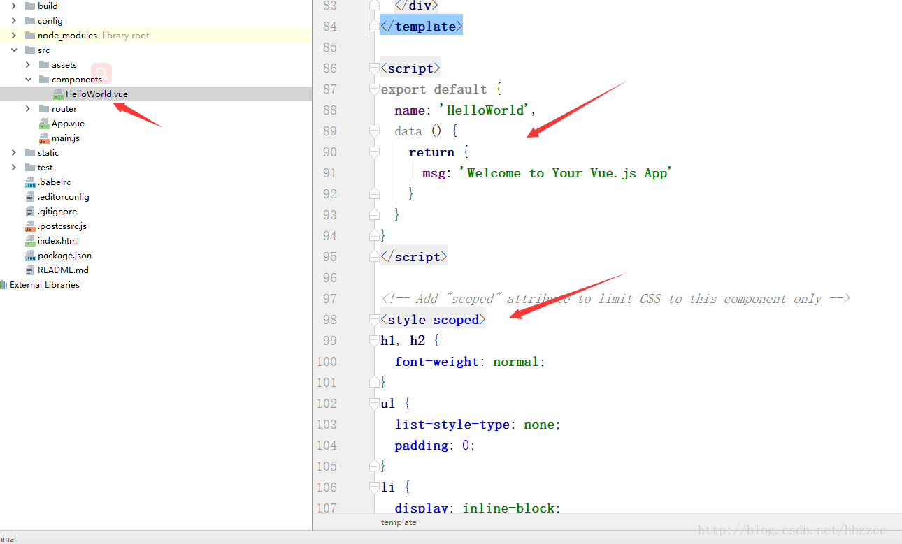 现在我们来看看HelloWorld.vue这个页面,这里js,css的代码放置格式它已经帮你写出来了,按照这种格式写就行了,需要提醒的就是style标签中的scoped属性,如果没写这条那么这个style的样式会影响到这个页面所有的子路由,如果加了那么这个样式只对当前页面起作用