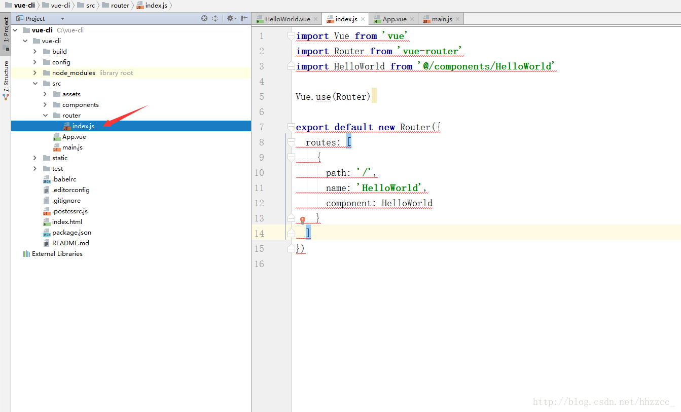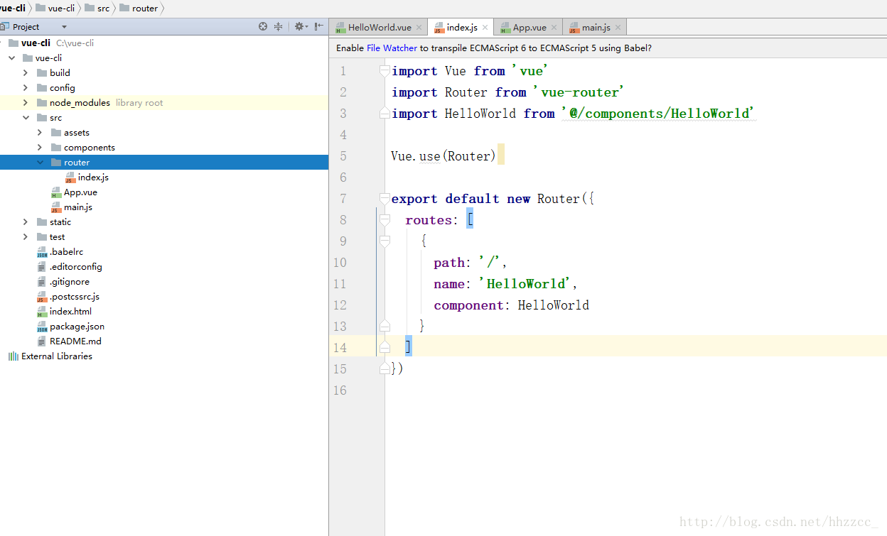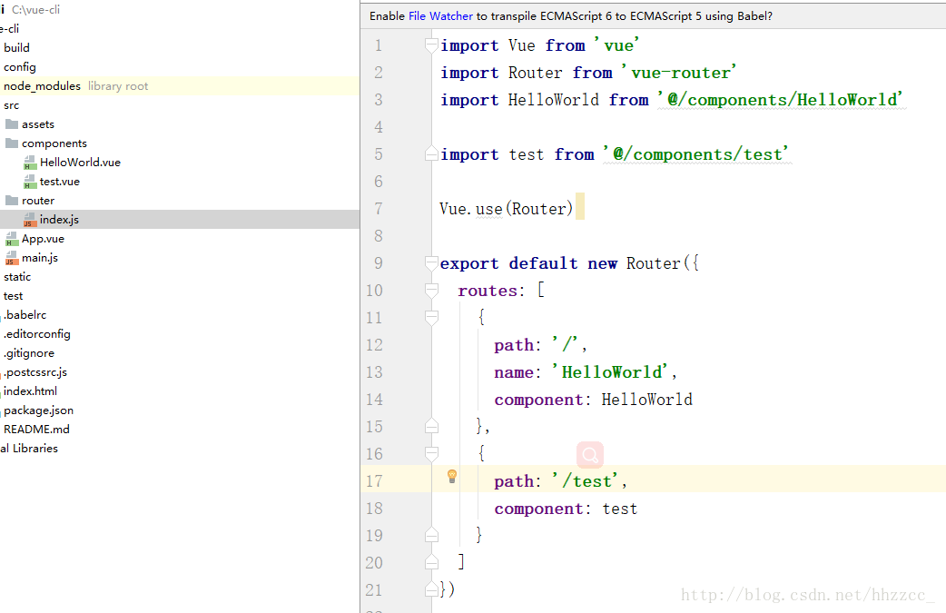 路由的路径在router下,刚开始打开会看到有报错,其实不是语法错误,是因为编译器默认编译es5的语法,而vue脚手架用的是es6的语法,我用的编译器是webStorm,只要设置一下就行了。