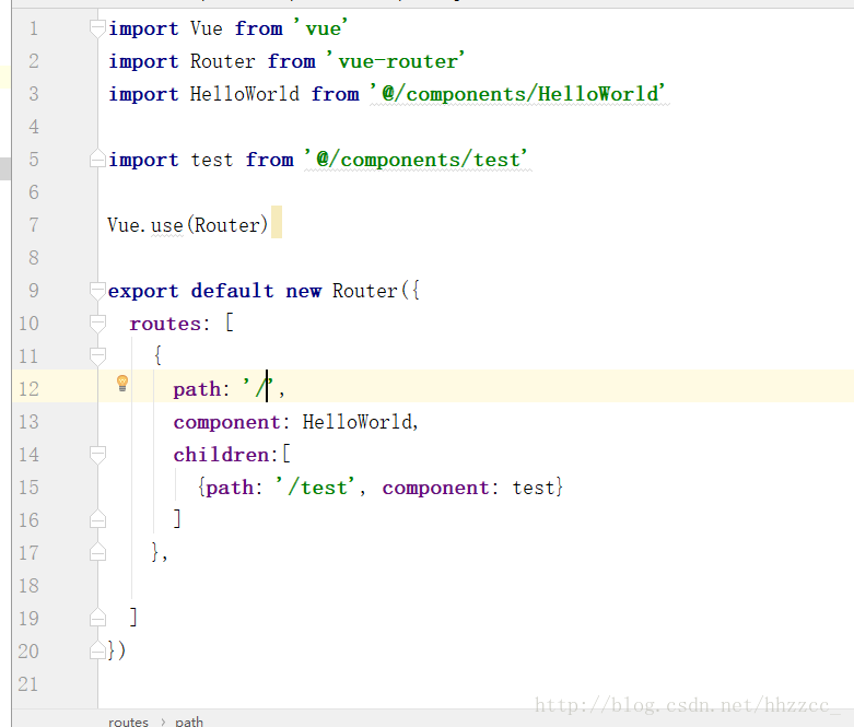 简单介绍一下routers中的结构,这里主要用来配置路由的,上面说过所有子路由都在App.vue下,所有App.vue是最外层的父路由,这里的routes中存的就是路由的数组,path就是你要访问你所创建的页面的路径,这里写的是根路径序所以你直接访问localhost:8080就会出现一个App.vue中插入一个HelloWorld.vue的页面(这个相当于路由嵌套),name想到与给它命名这个比较无关紧要,component相当于你要引用的页面,这里引用的是HelloWorld.vue这个页面,主要上面的import,这里的HelloWorld是一个变量,对应上面的路径文件