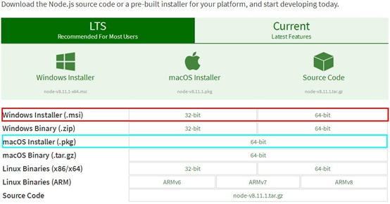 1.想要使用Node.js,必须先配置开发环境。进入Node.js官网下载指定平台安装包(nodejs.org),Windows系统下载安装红框的安装包,macOS 下载安装蓝框的安装包,看清楚自己电脑是32位还是64位。一直下一步直到完成就好。