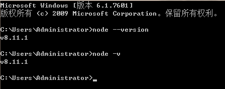 2.配置开发环境完毕后,在cmd控制面板输入node(空格)--version或者node(空格)-v,回车后会立即得到一个结果,而这个结果就是Node.js的版本号,即安装成功。