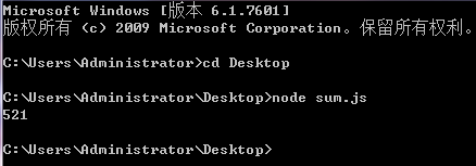 4.编译型运行。通过cmd控制面板进入你想运行的js文件的所在目录文件夹,假如你的sum.js文件在桌面,进入(cd为进入命令)桌面目录(Desktop),输入node(空格)sum.js,回车即可得到结果。