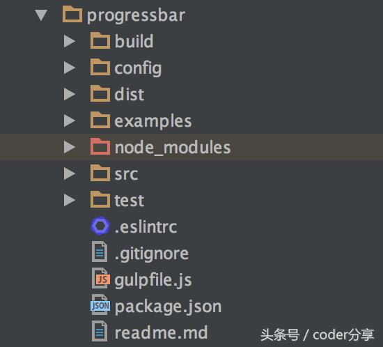 progressbar组件在一个可以直接运行的npm包,通过Yeoman进行构建,再通过Gulp+Webpack构建工具,生成的工作目录如下,其中各个文件夹的内容入之前的一篇文章一样