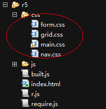 这时回到r5/css目录会发现多了一个built.css文件,该文件是另外四个css文件的合并项。