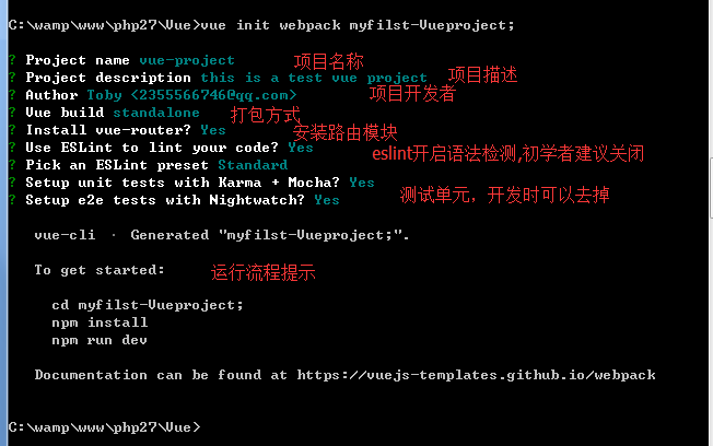 运行:vue init webpack myfilst-vueproject(自定义文件目录名称)