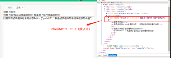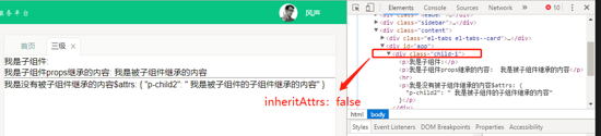 我的解释就是:没有被子组件继承的父组件属性,不会当做特性展示在子组件根元素上面。说起来,听起来好像有些拗口,看截图看代码你就明白了